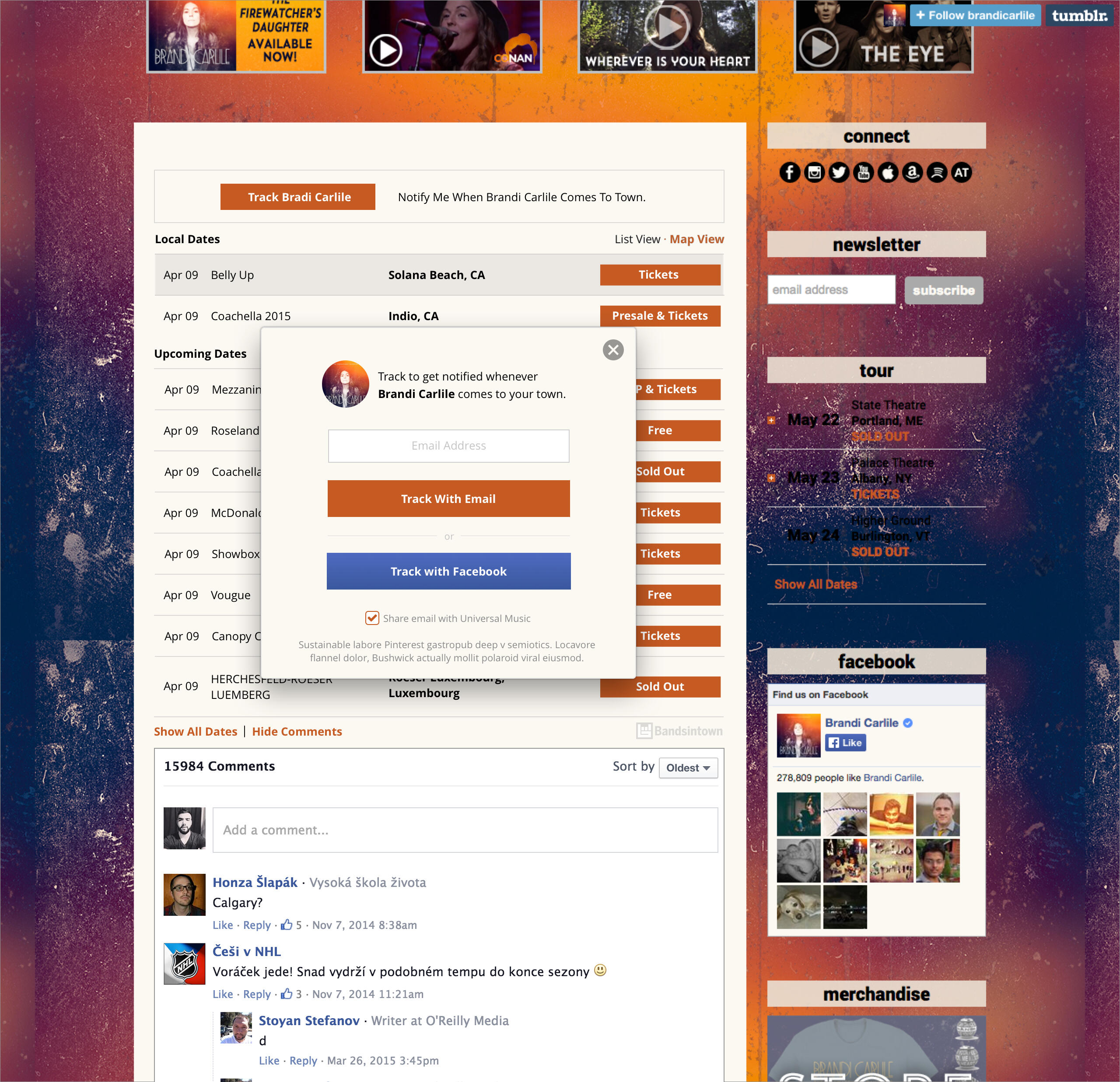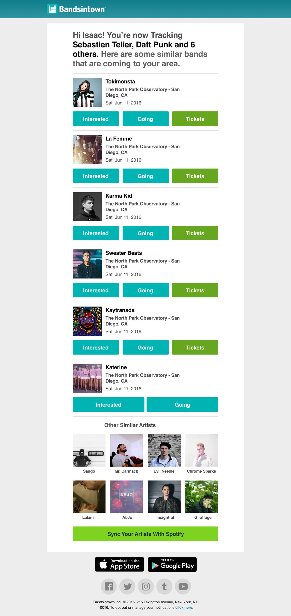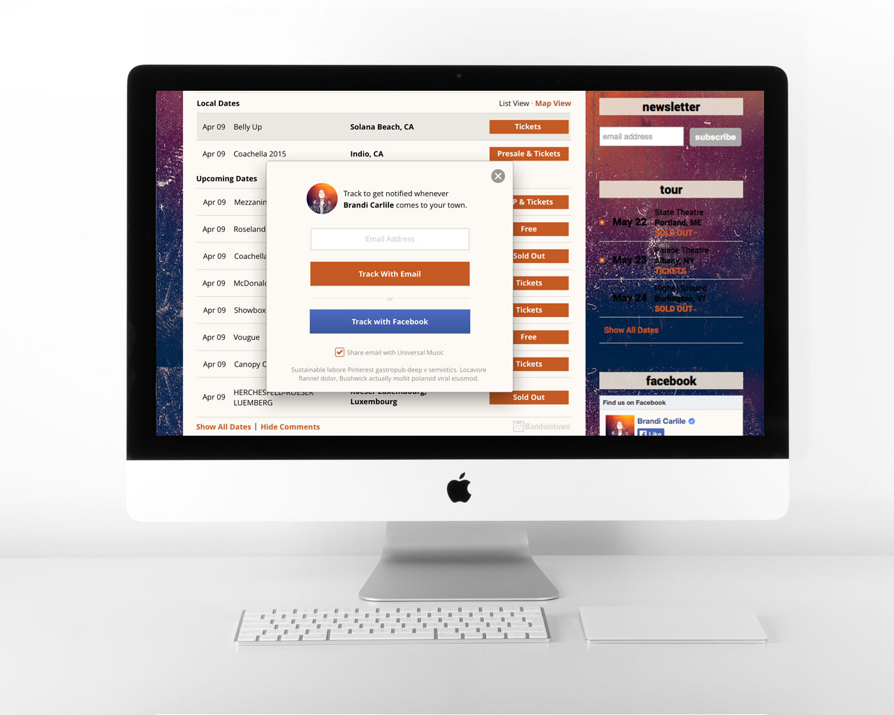 We started working on Bandsintown in 2006 (w/ zero users), I incorporated the company in 2007, and lead strategy, design, product, and growth until June 2016, when we surpassed 25 million registered users.I acted as CEO and sole designer for 7 years (2006 – 2012), after which the company was acquired and I became VP of Product.
