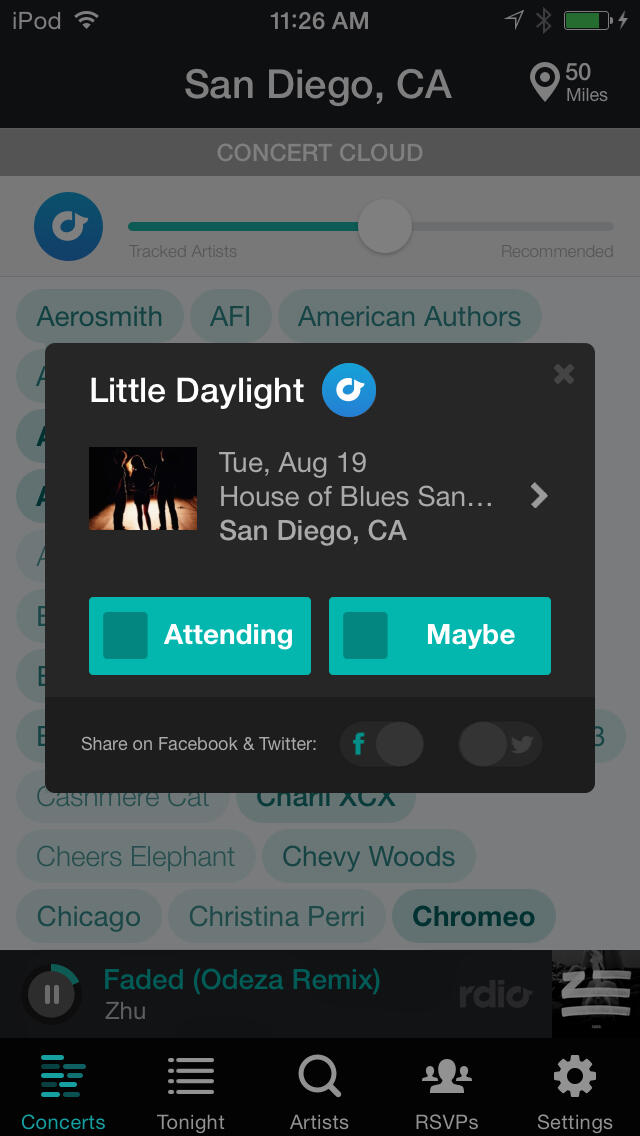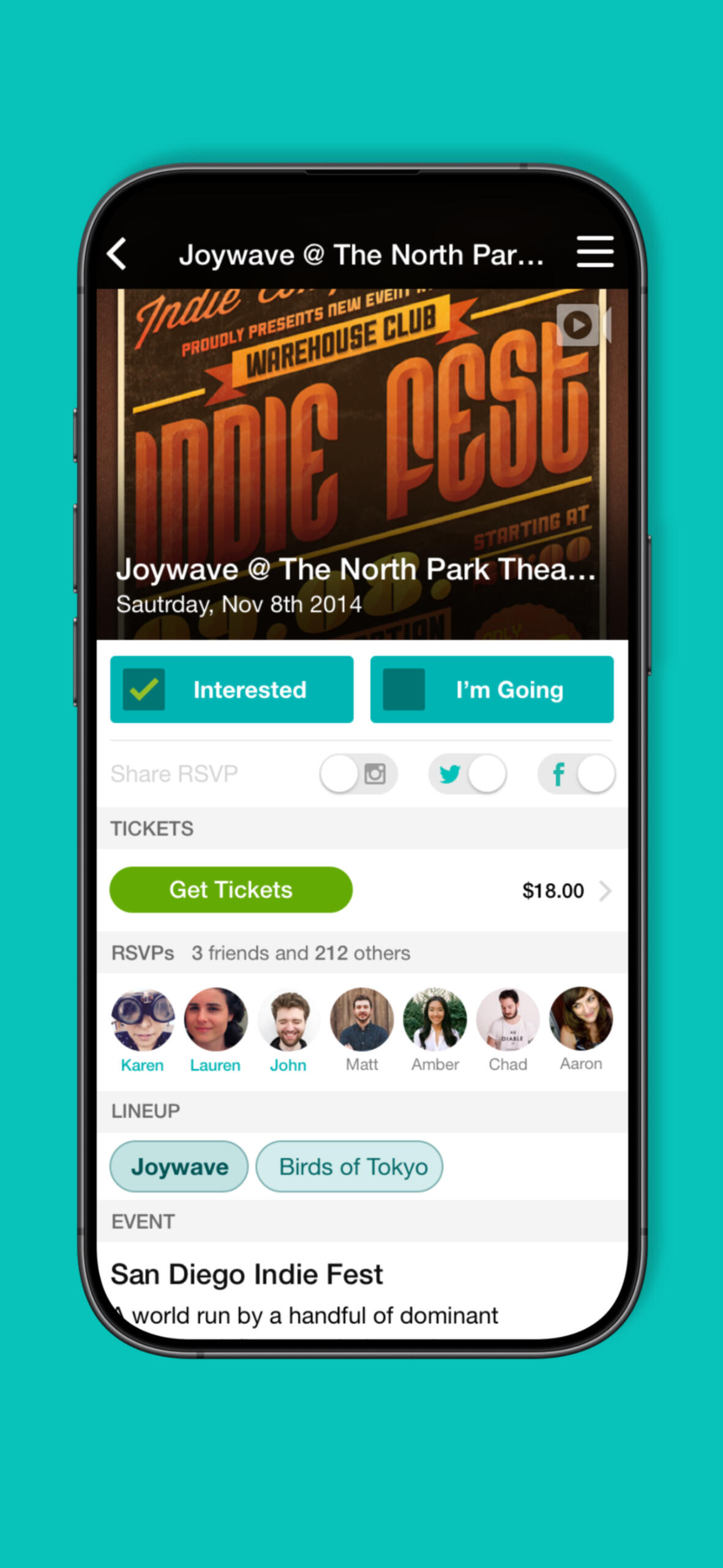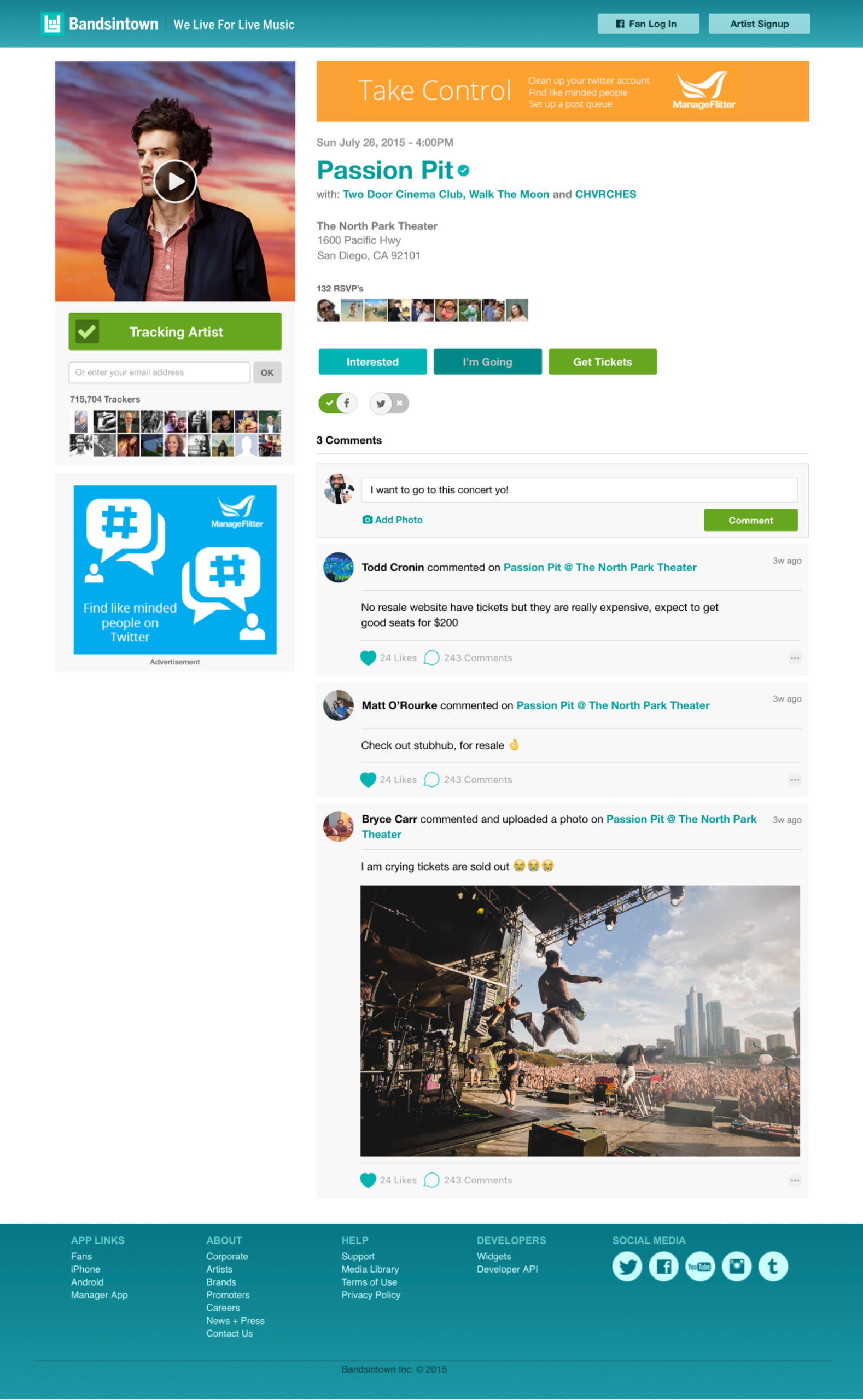 We started working on Bandsintown in 2006 (w/ zero users), I incorporated the company in 2007, and lead strategy, design, product, and growth until June 2016, when we surpassed 25 million registered users.I acted as CEO and sole designer for 7 years (2006 – 2012), after which the company was acquired and I became VP of Product.